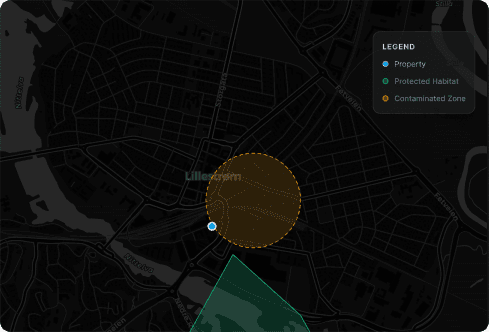 See how each property affects its surrounding environment. We map proximity to protected areas, vulnerable habitats, red-listed species, and contaminated land — showing both what's at risk and what triggers regulatory attention.